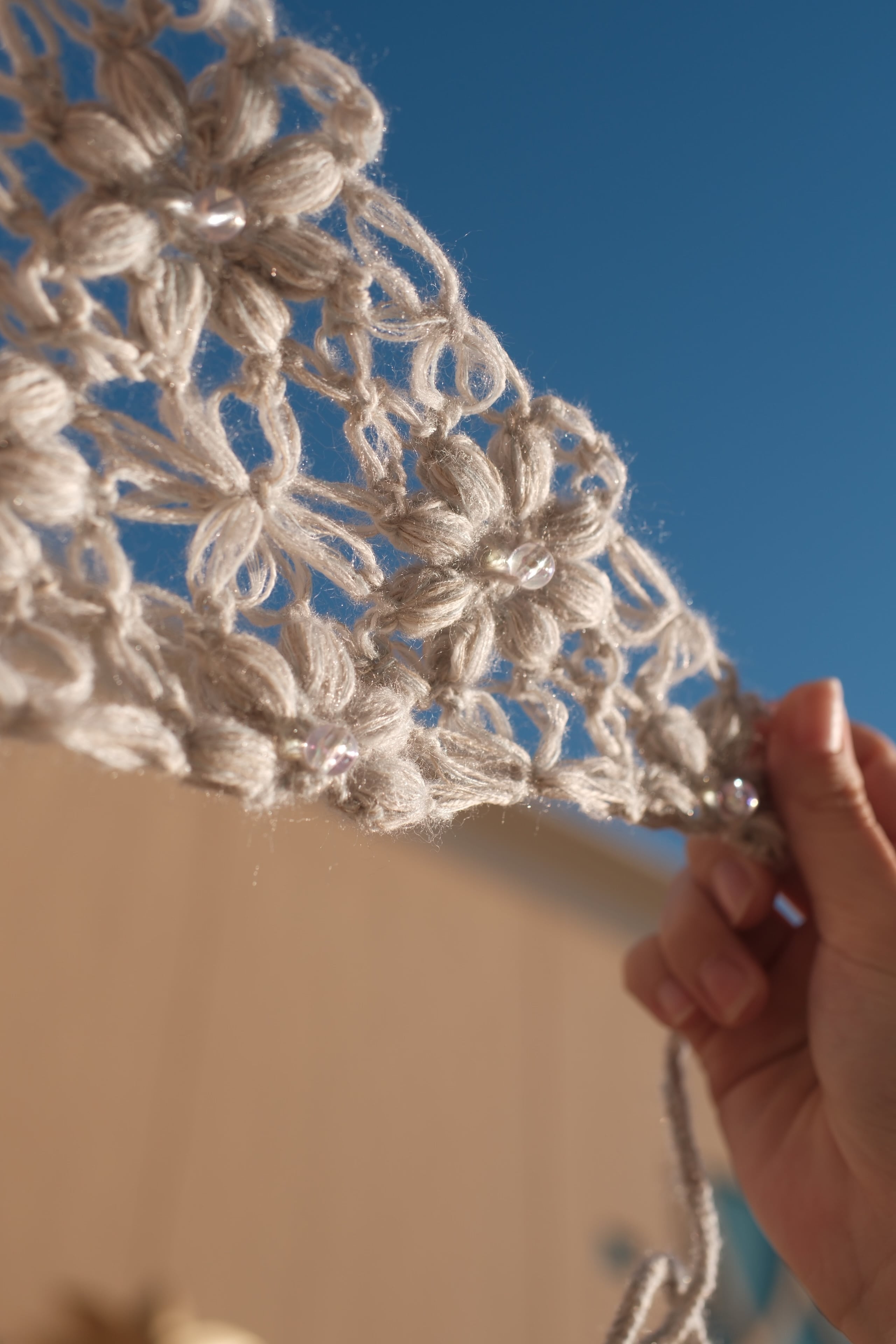 編み物だけどレースっぽさもある 唯一無二のデザイン 柔らかなグレーの 清楚な雰囲気があるバブーシュカ 散りばめられたビーズが可愛らしさも プラスしています。 シンプルな服装にもかわいい服装にも バブーシュカをつけたことがない方でも 使いやすい色です ⚠️お取り扱いについて 汚れた場合は、ぬるま湯に中性洗剤を溶かして優しく手洗いしてください。 引っかかったり、強い力を加えたりするとほつれや歪みに繋がりますので、ご注意ください。