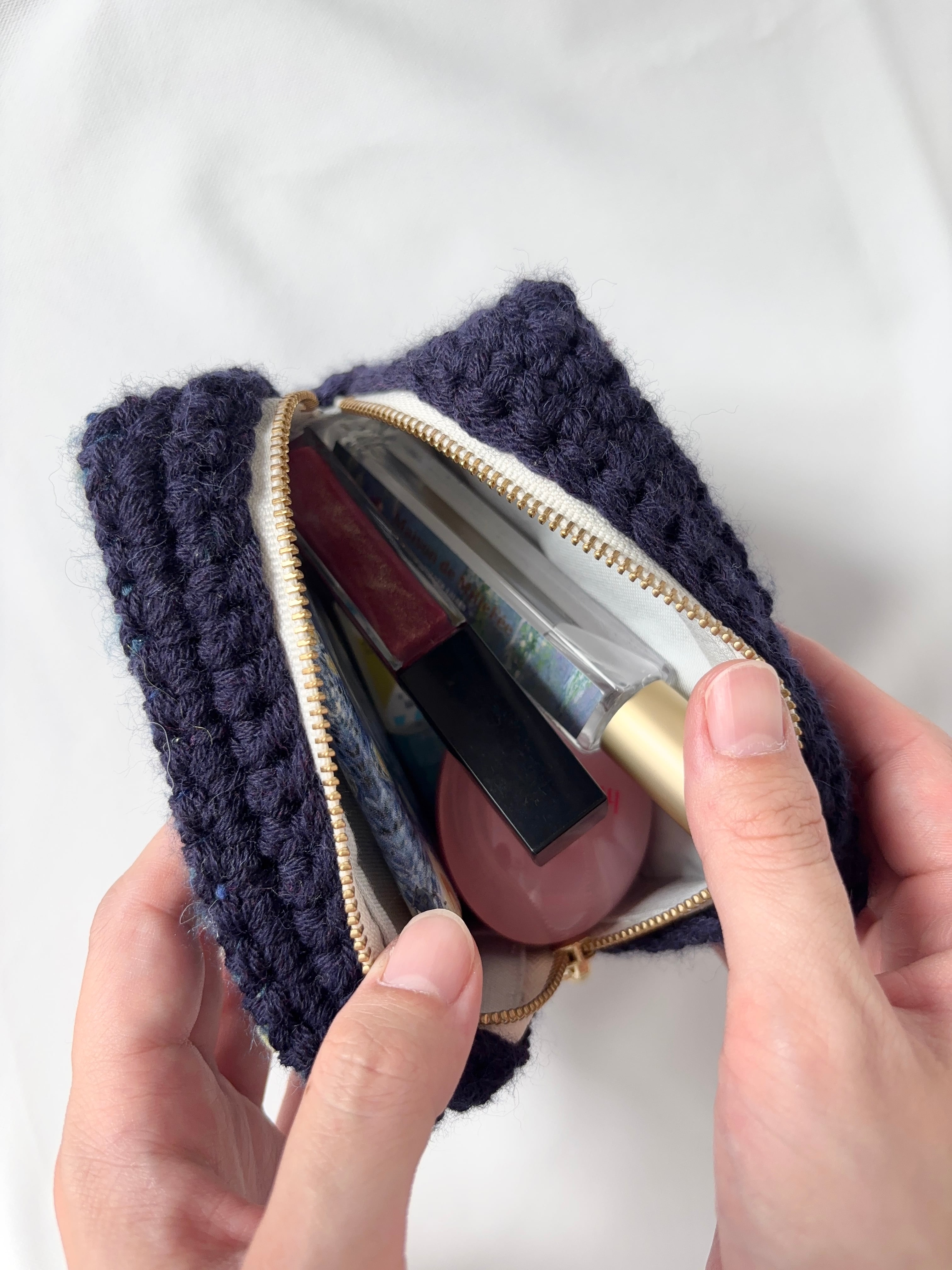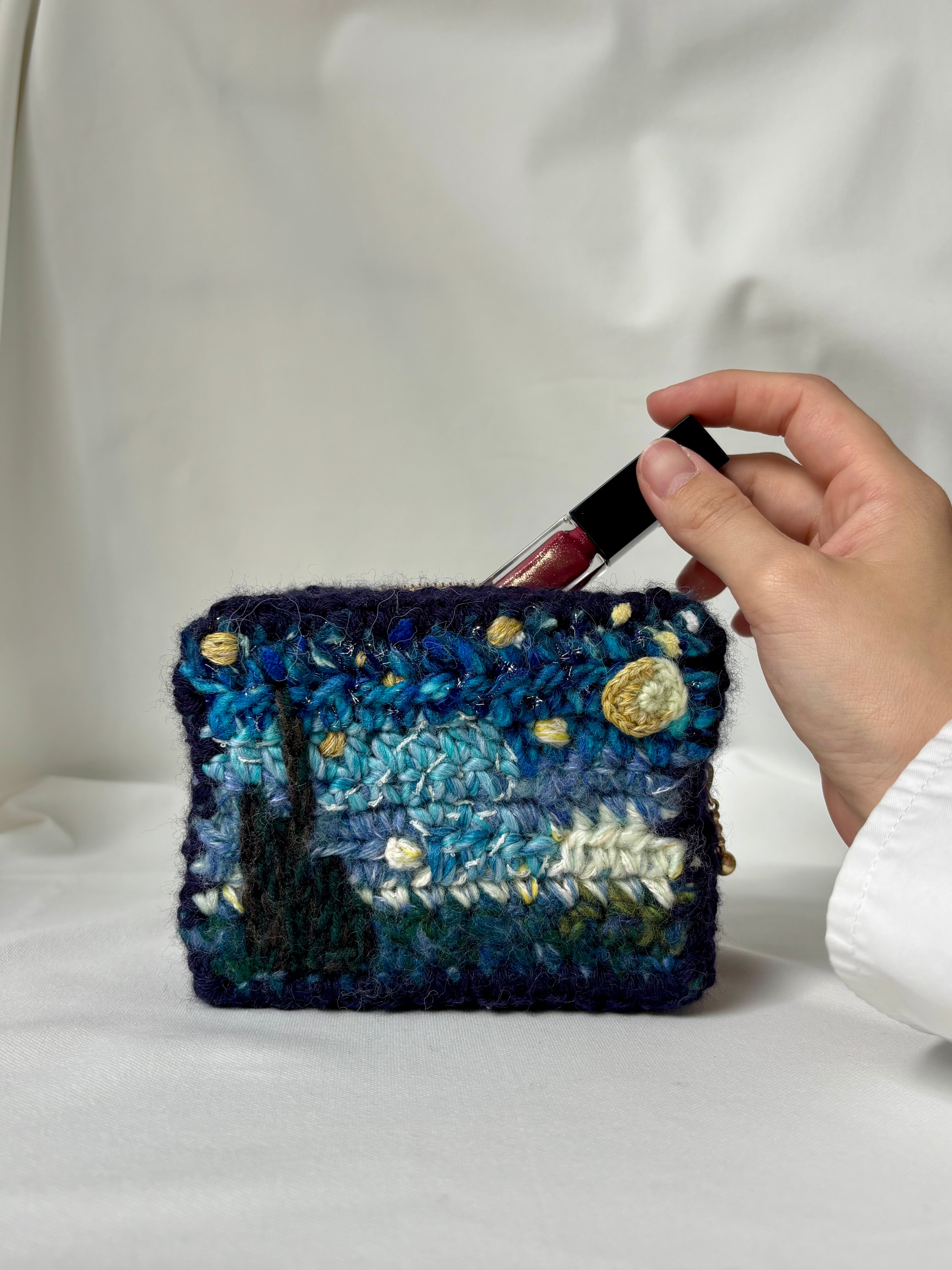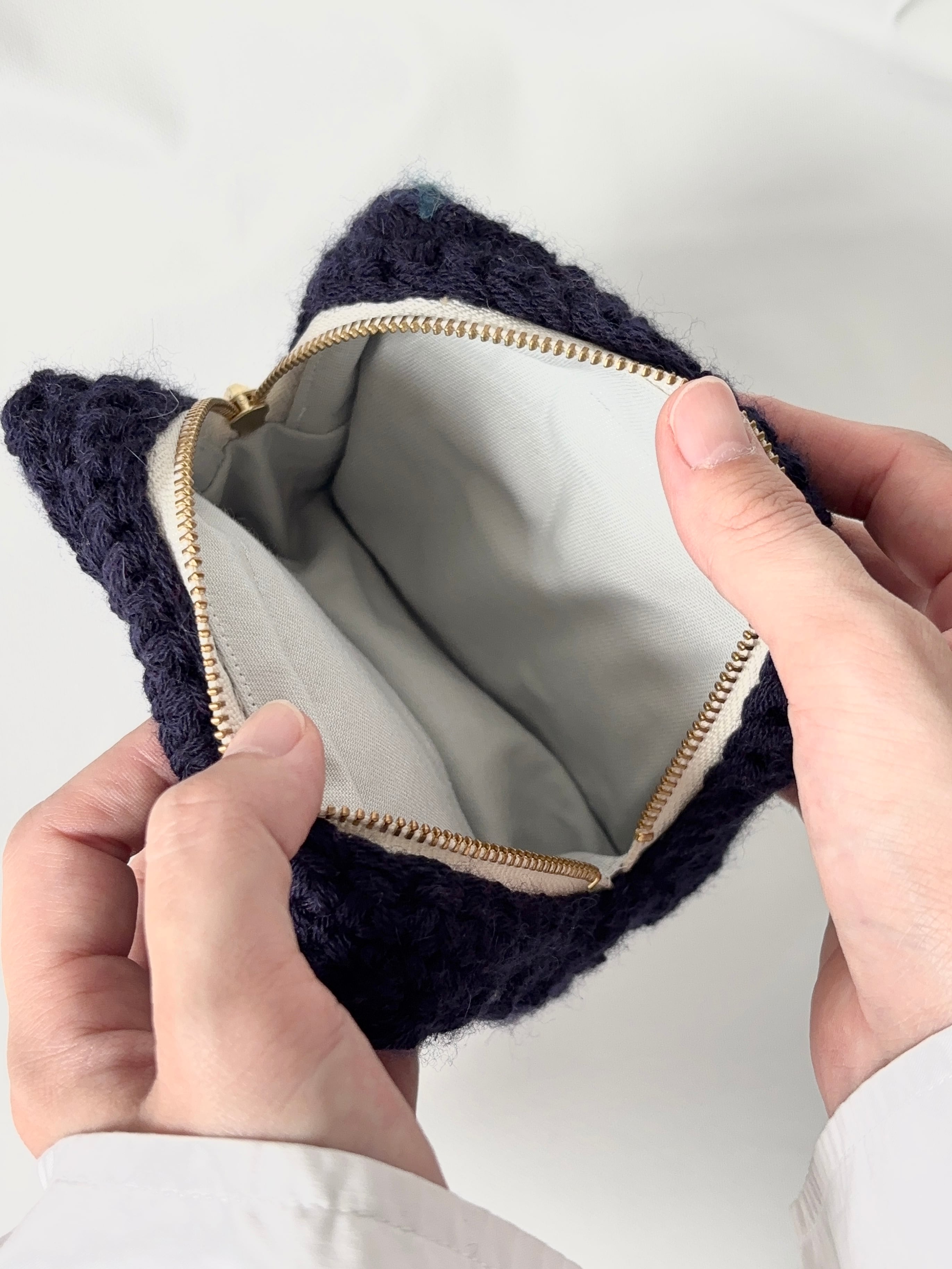 その感動を、自分の手で編み物という形に閉じ込めたい——そんな想いから生まれたポーチです。