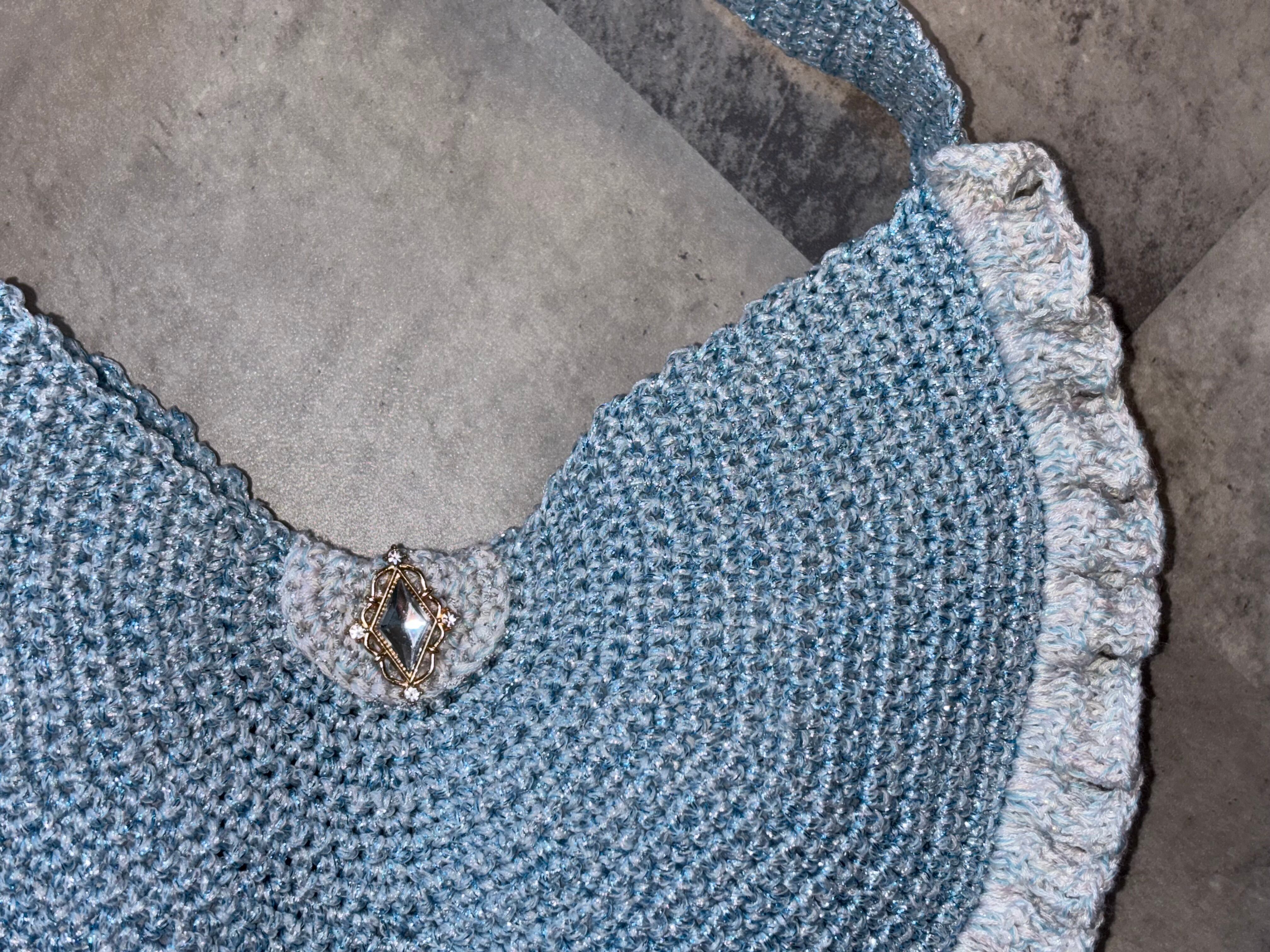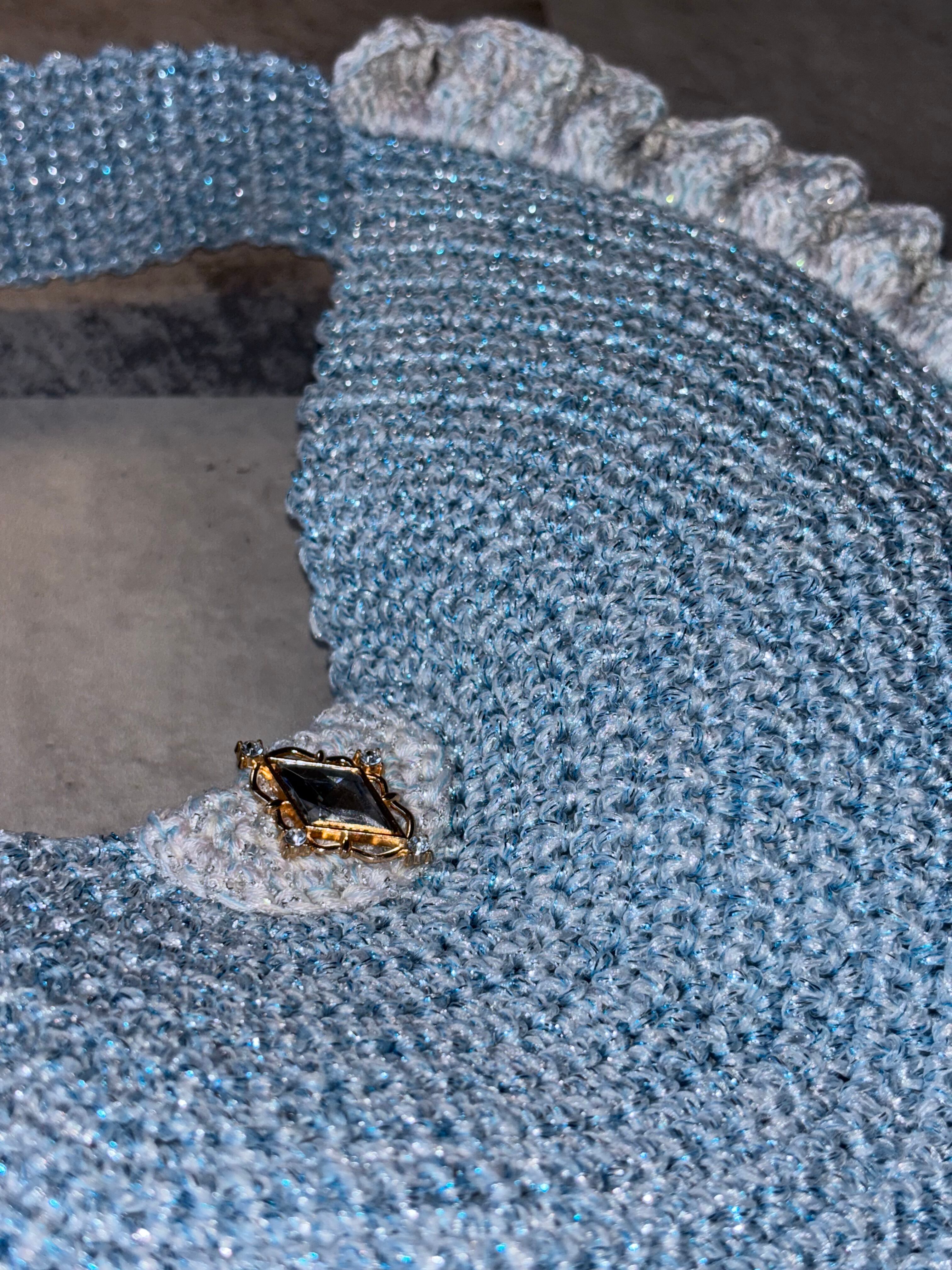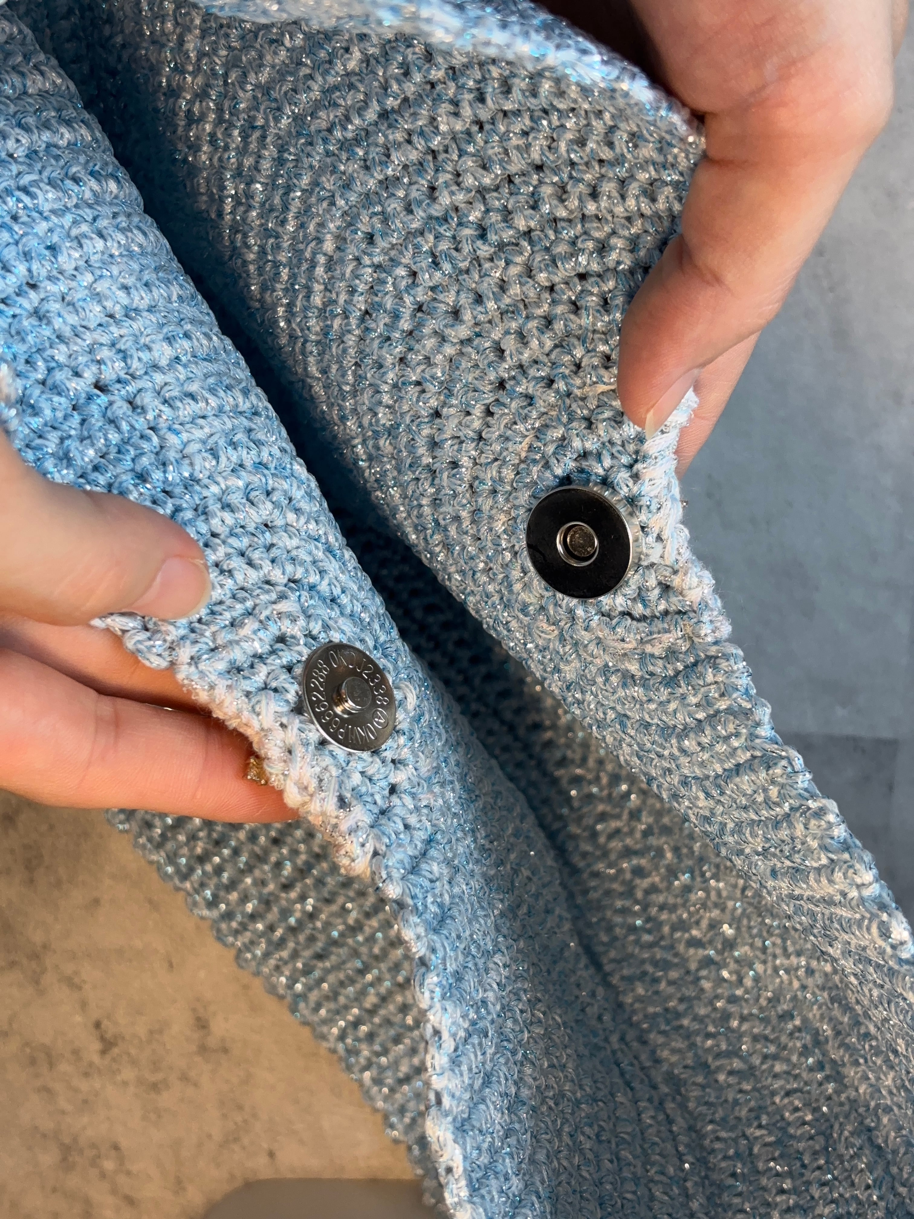 光に当たるとキラキラする編み地が特徴。