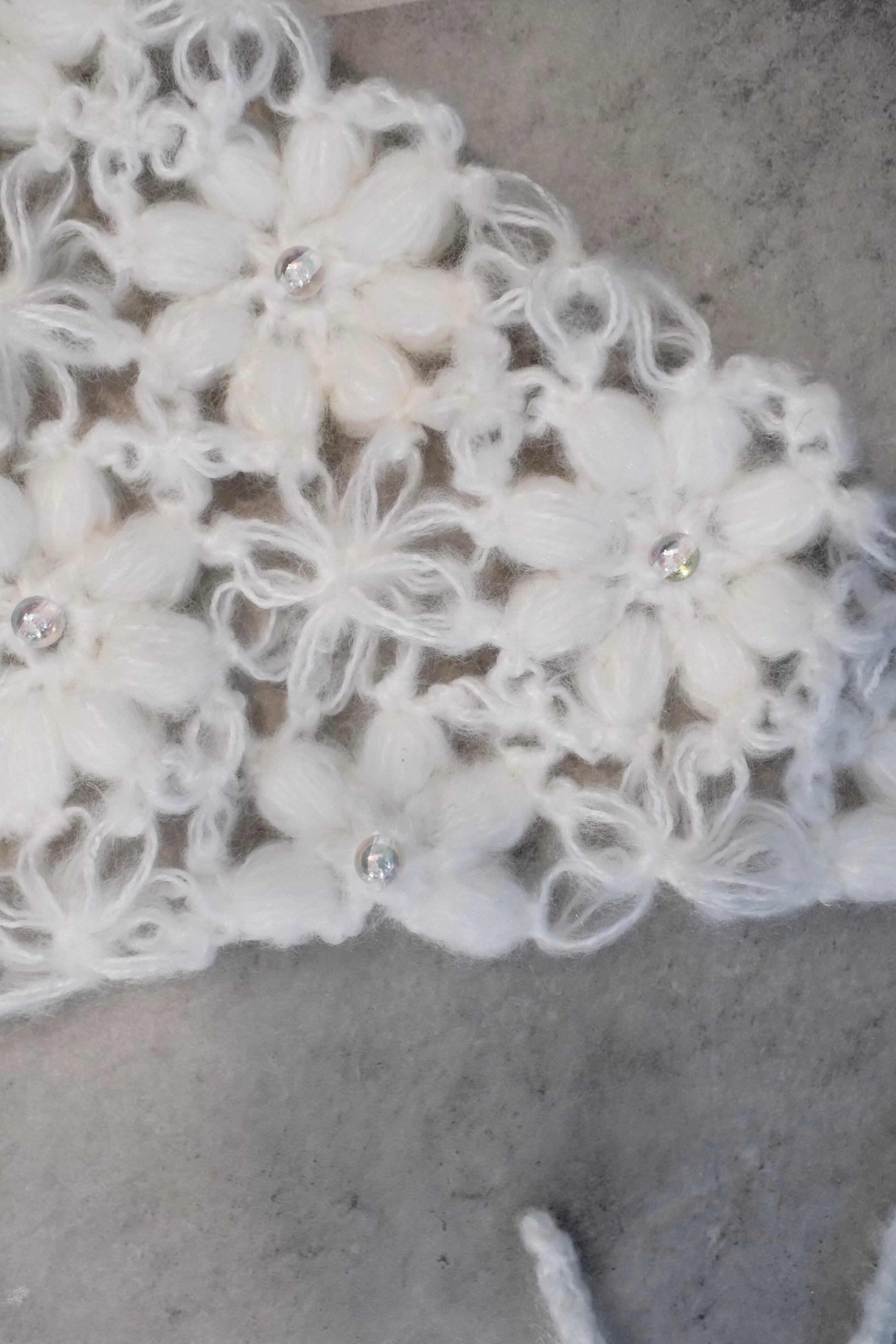 白のモヘア糸で編んだ